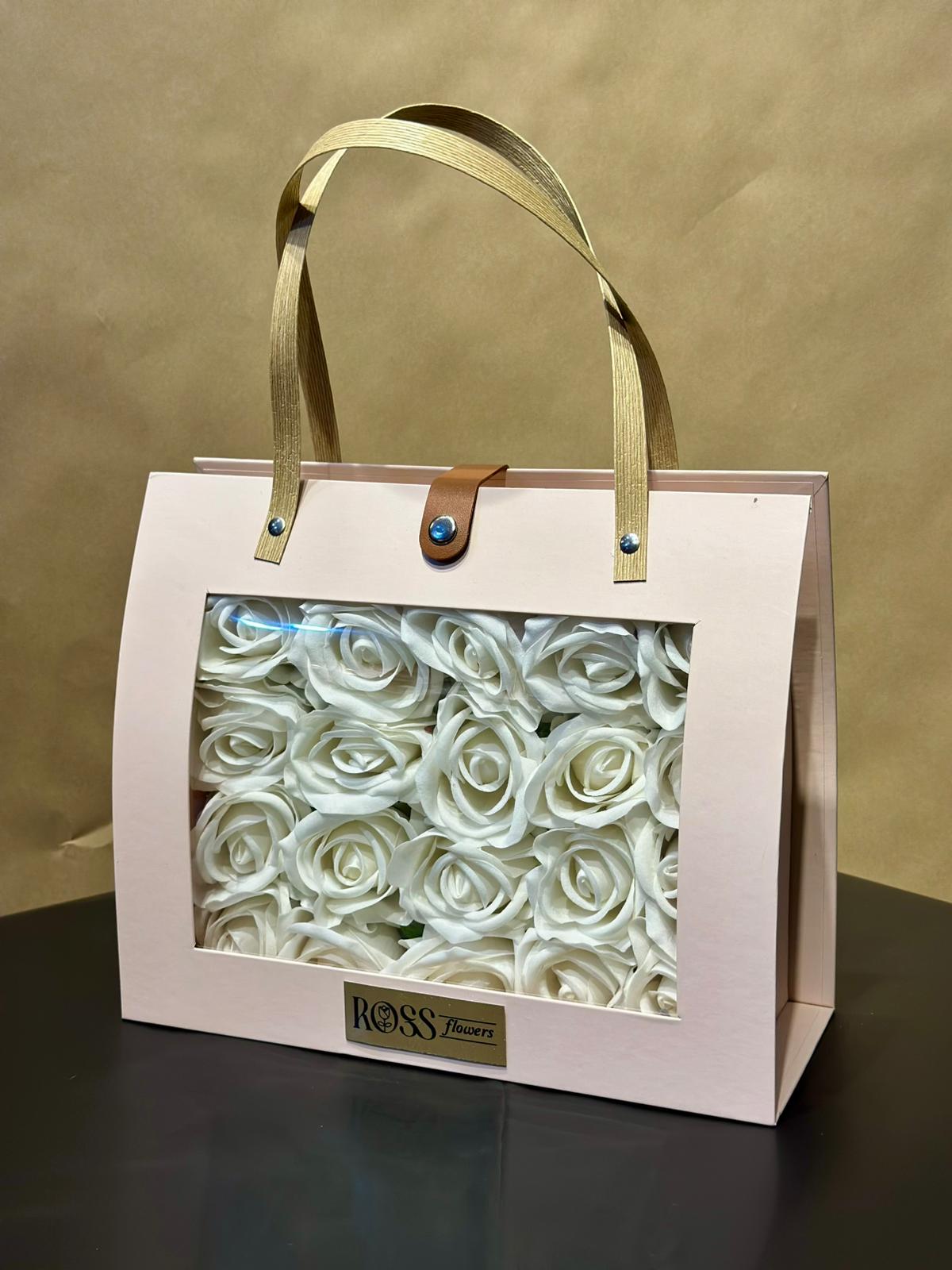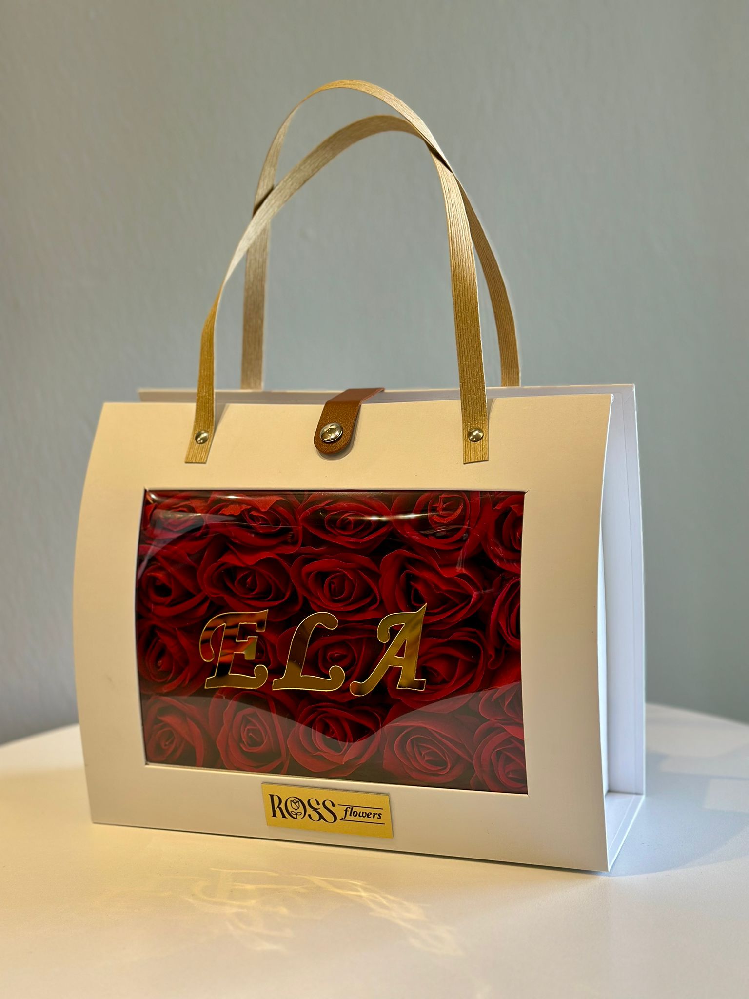 Kadife dokulu ithal güller, kişiye özel isim baskılı çanta ile birleşerek hem kalıcı hem de çok özel bir hediye sunar.